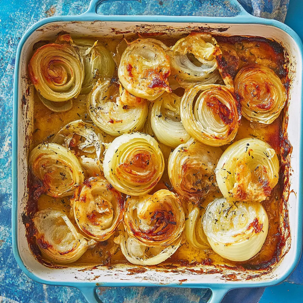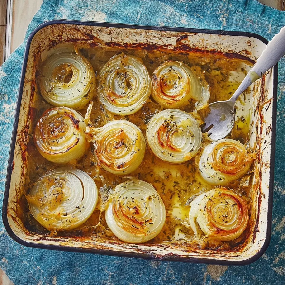 4. Disposez dans le plat : Transférez les oignons assaisonnés dans un plat à gratin de 33×23 cm (13×9 pouces) préalablement huilé.