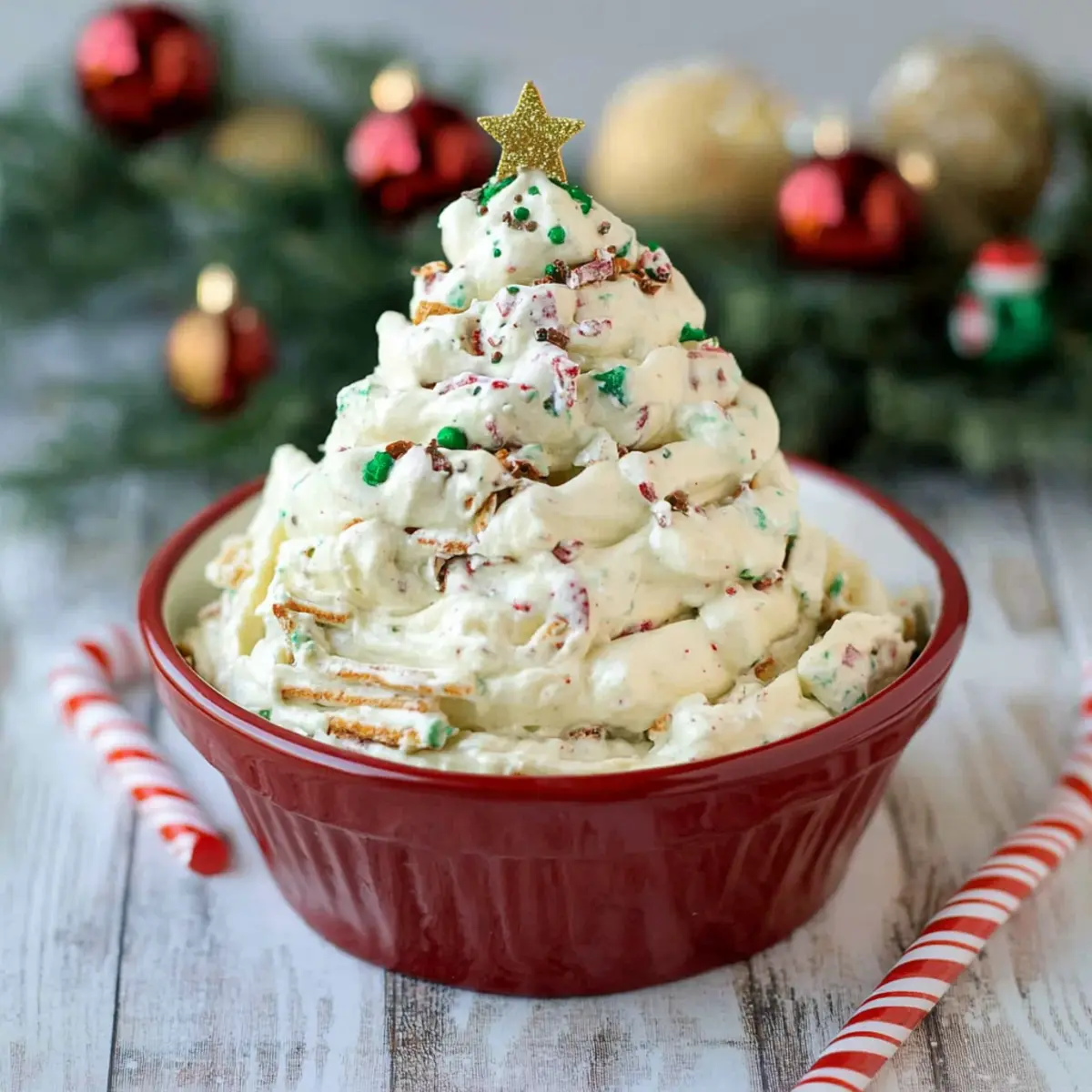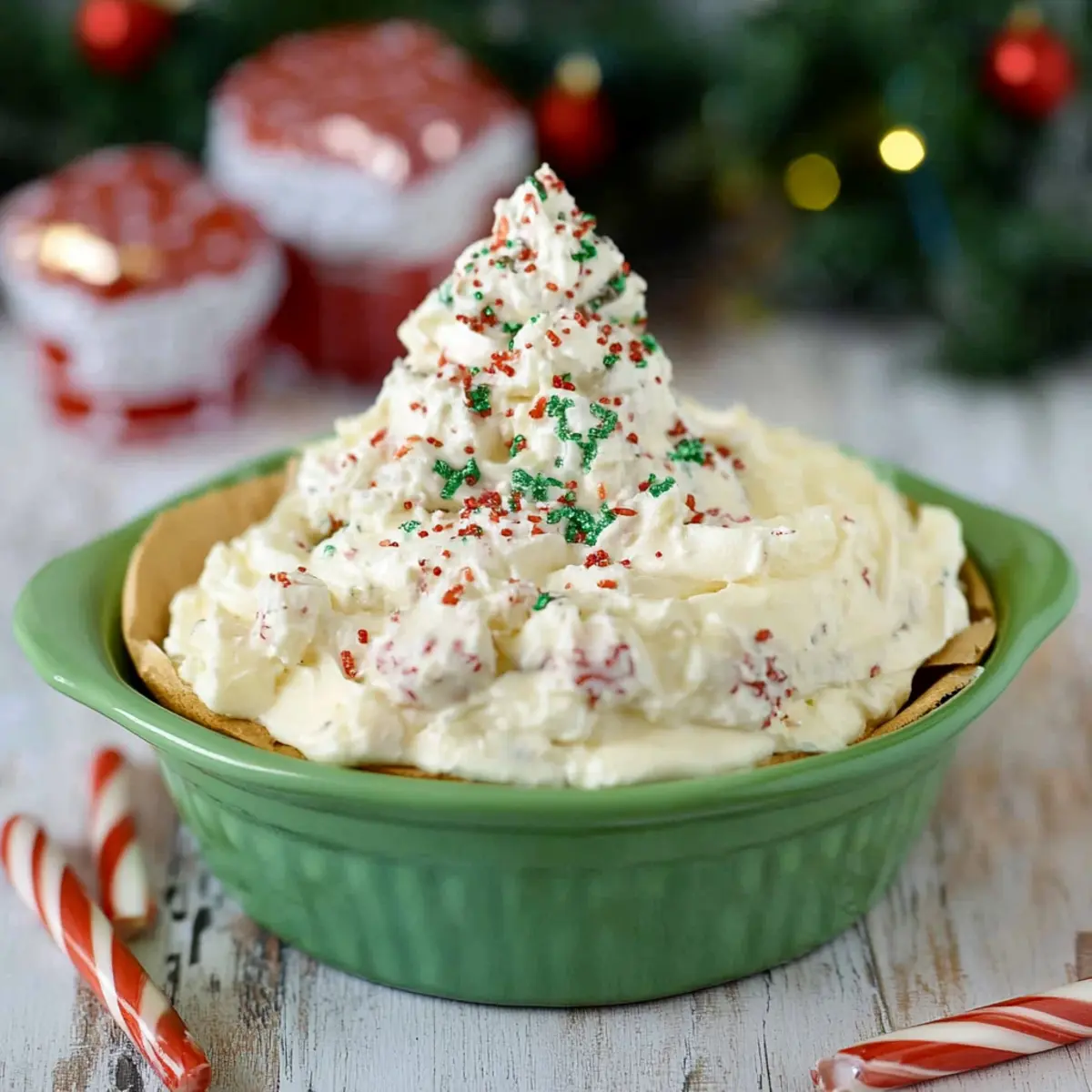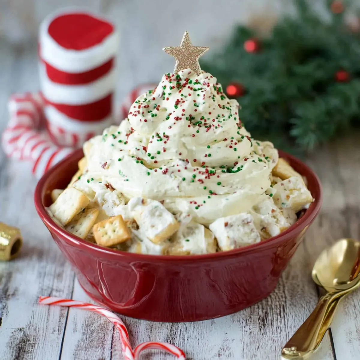 - Servir : Transférez le dip dans un bol de service, déposez la moitié de gâteau réservée sur le dessus, et saupoudrez de décorations festives juste avant de servir.