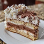 - Fouettez la crème jusqu’à obtenir des pics fermes et étalez-la sur le dessus du gâteau, puis saupoudrez de copeaux de chocolat.