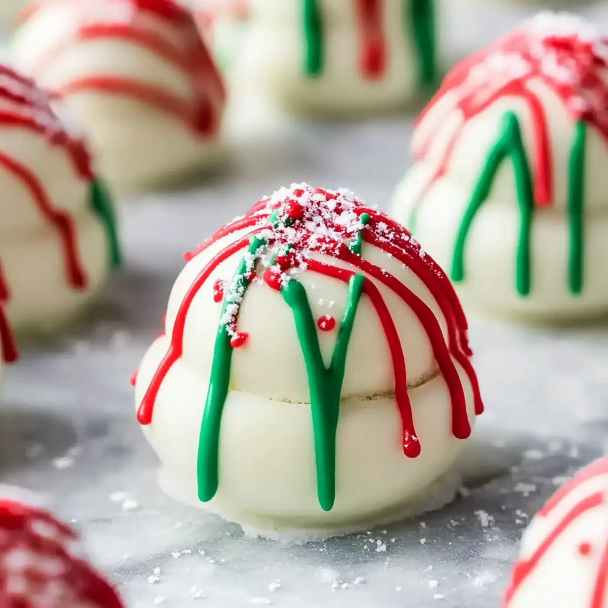 Décorez les truffes avec le chocolat rouge en filet et saupoudrez de sucre vert pour imiter les ornements de sapin.