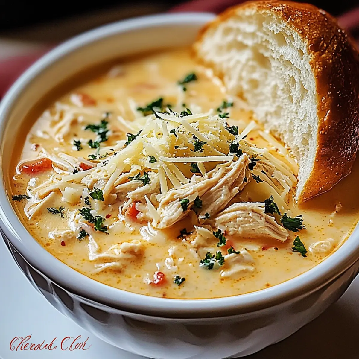 Cette recette de Soupe Crémeuse au Poulet Parmesan est la promesse d’un réconfort irremplaçable, parfaite pour réaliser en soirée sereine.